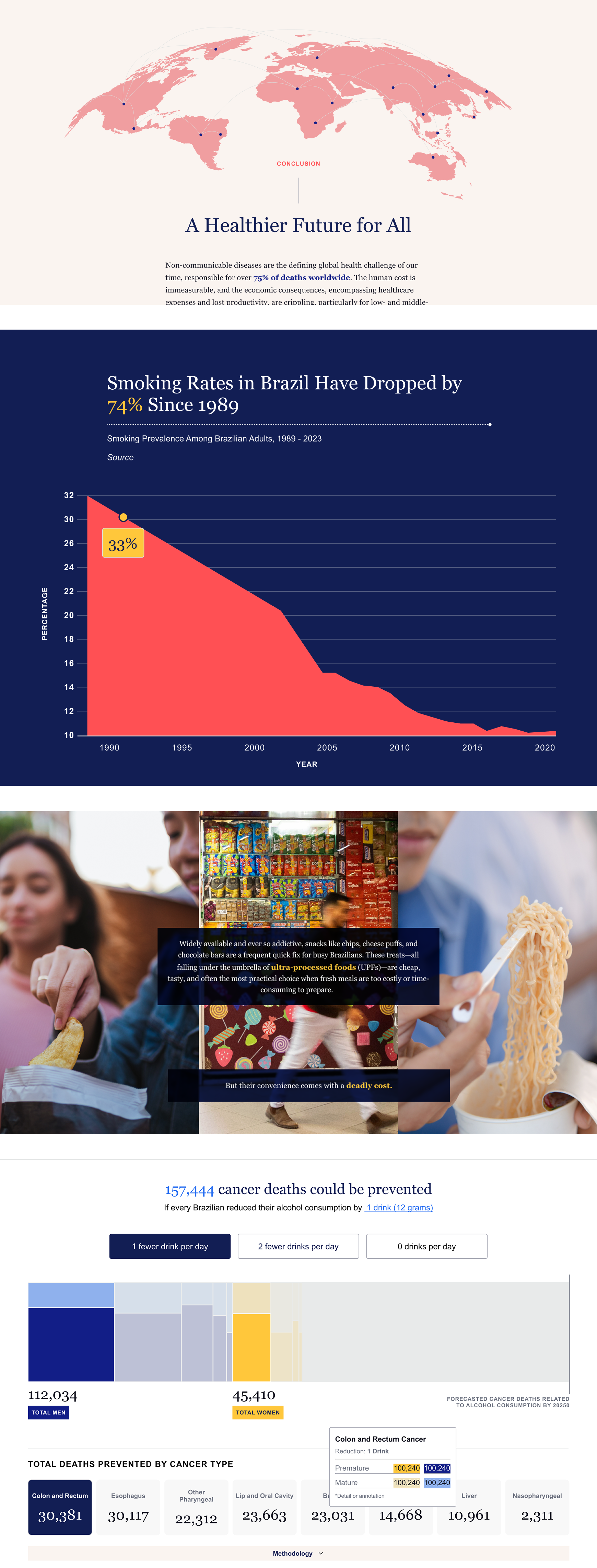 Vital Strategies is a leading global public health organization committed to reducing the burden of non-communicable diseases (NCDs). We partnered with their team to create an interactive digital story that communicates the progress and challenges of cancer prevention in Brazil. The result is a compelling narrative that connects data, interventions, and outcomes, helping Vital Strategies demonstrate their impact and laying the groundwork for future storytelling across the NCD ecosystem.
