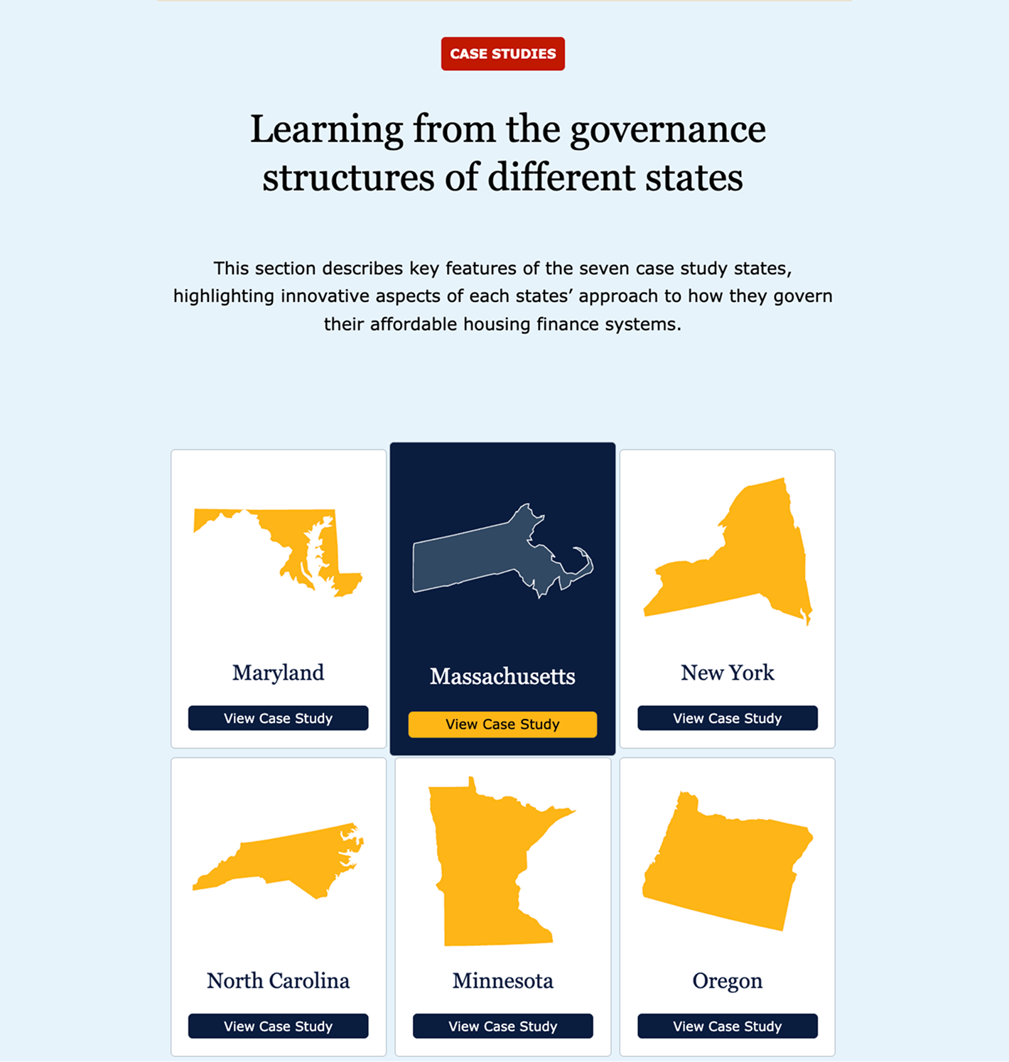 The design challenge for us lay in making those insights portable. We worked to move their data beyond the white paper, building an informative, interactive framework that allows 50 distinct state financing structures to finally see one another and learn from key case studies of success.